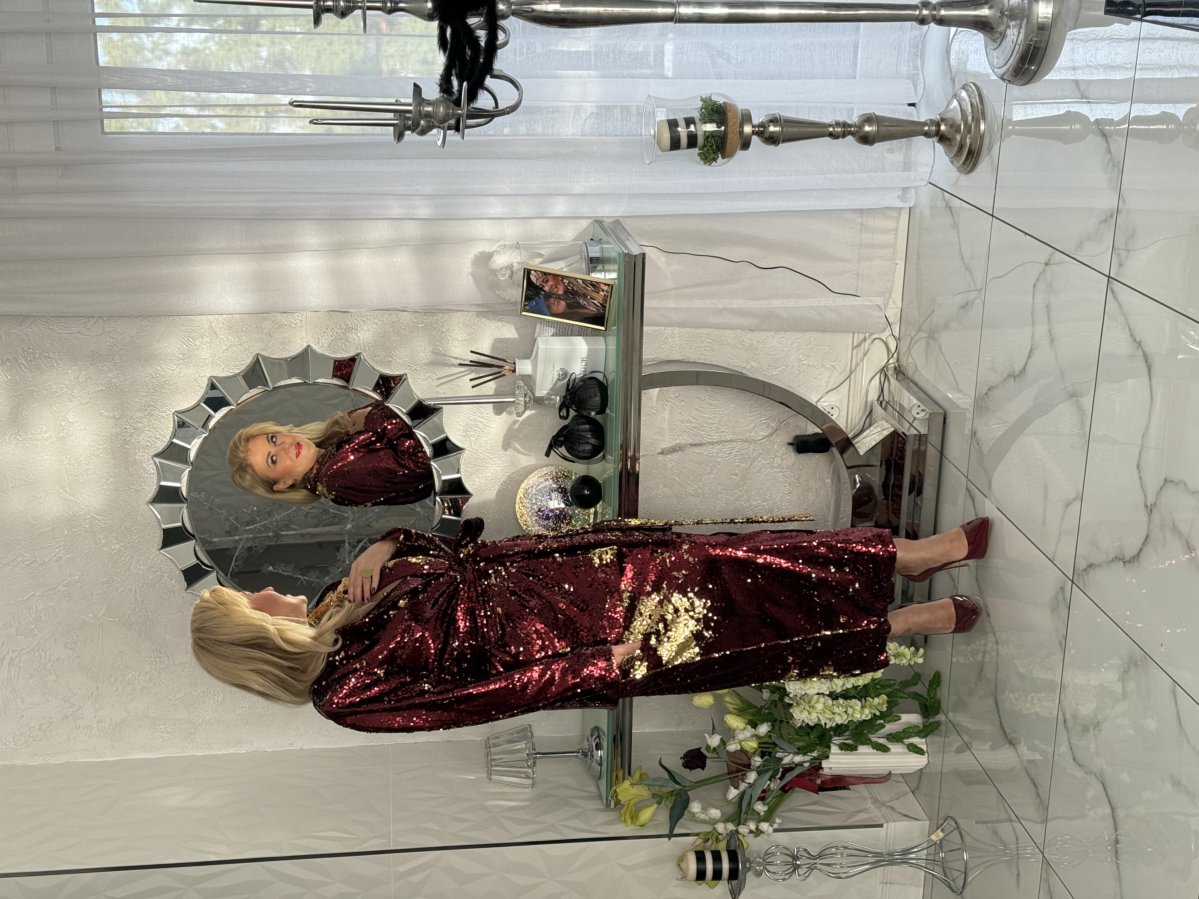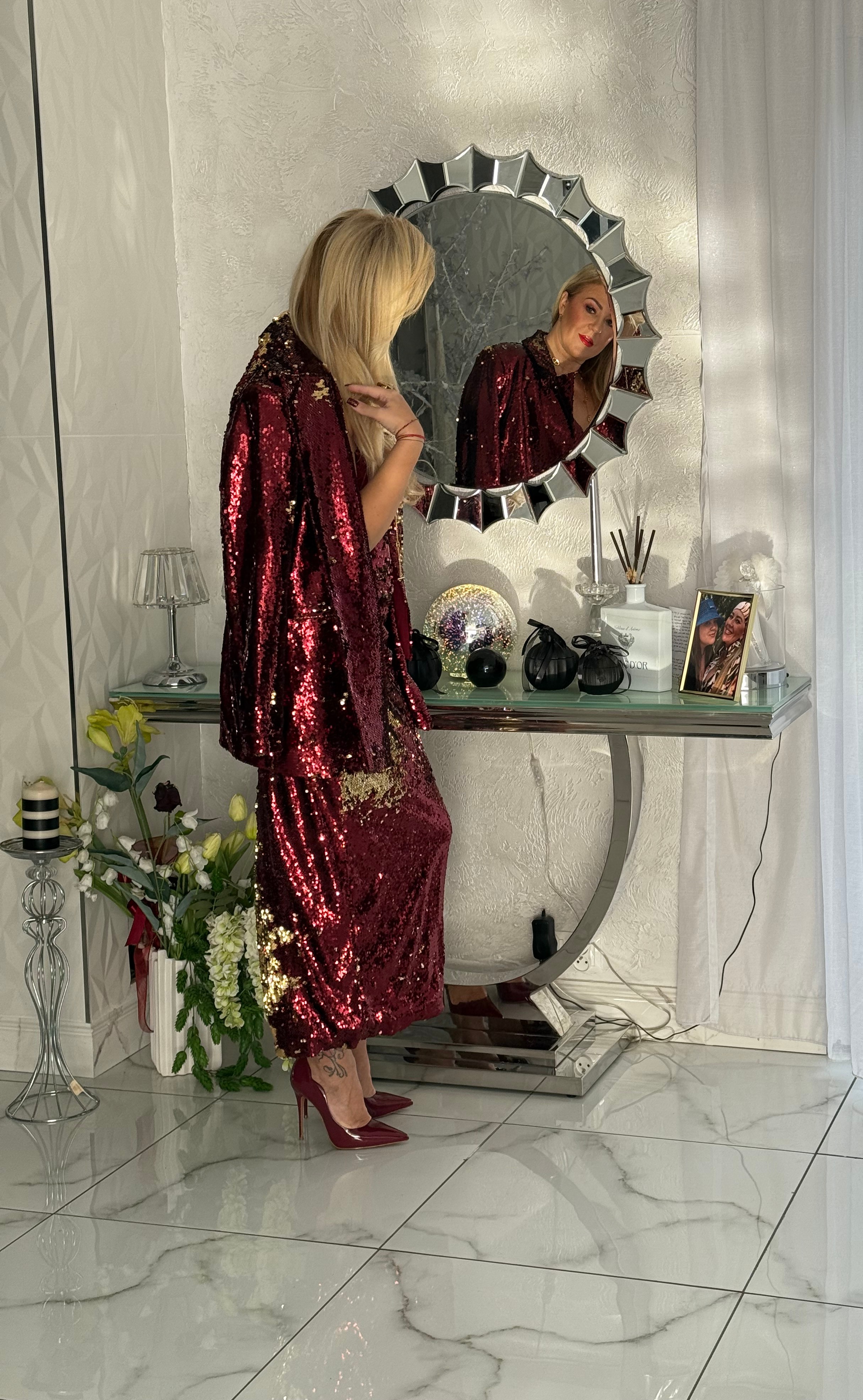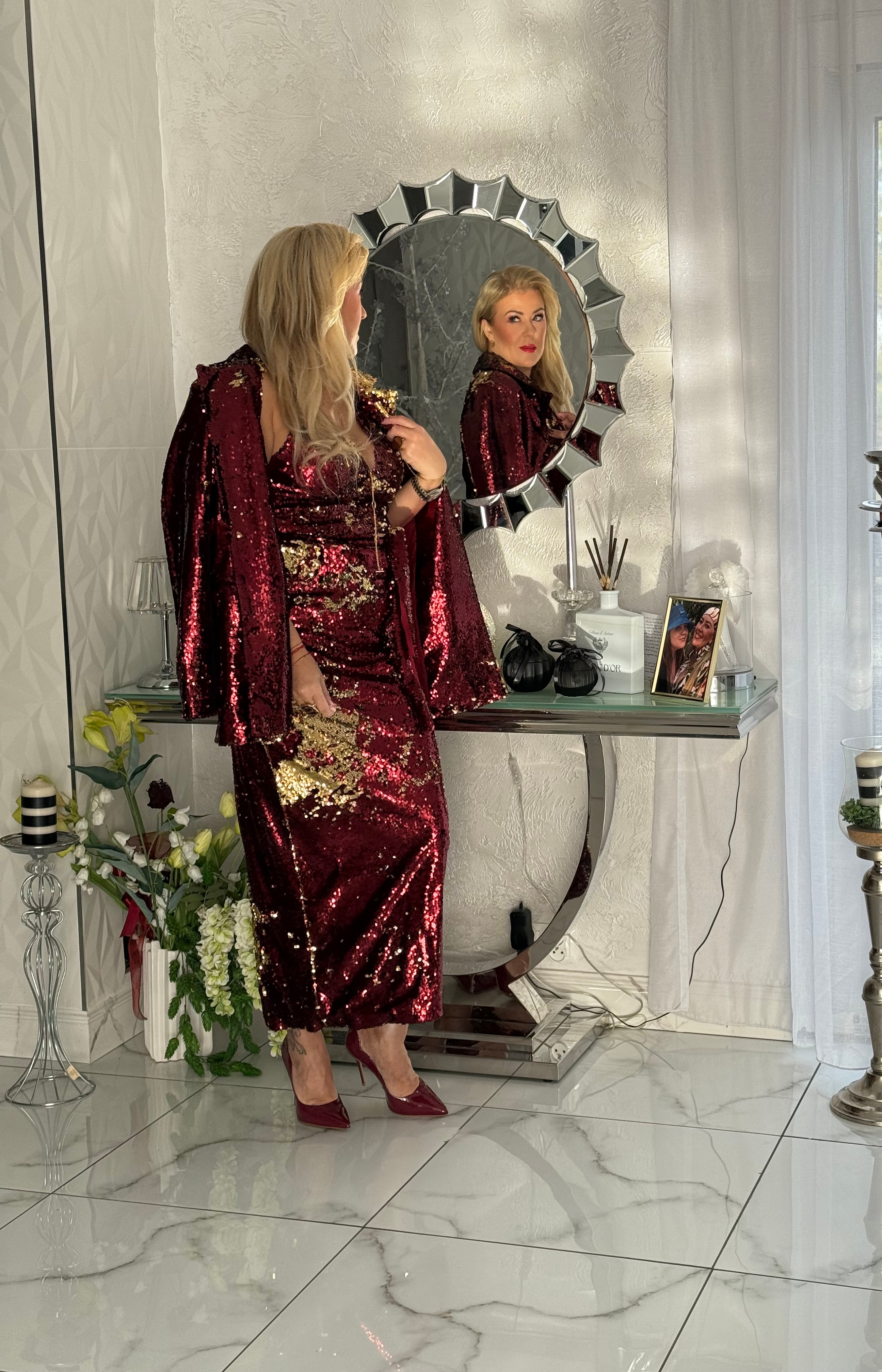 Marynarka z bordowego cekinu – klasyczny krój w błyszczącym wydaniu.