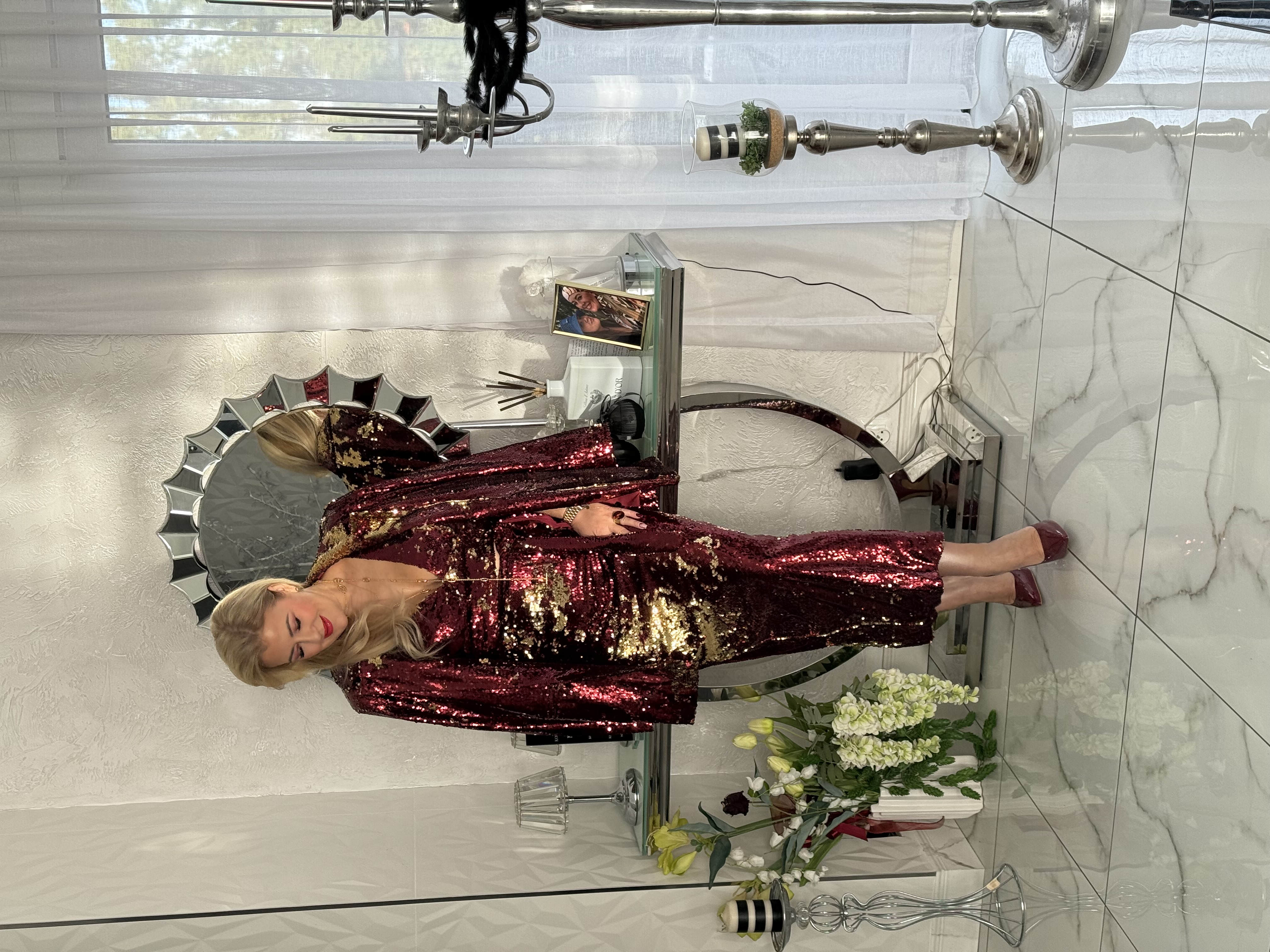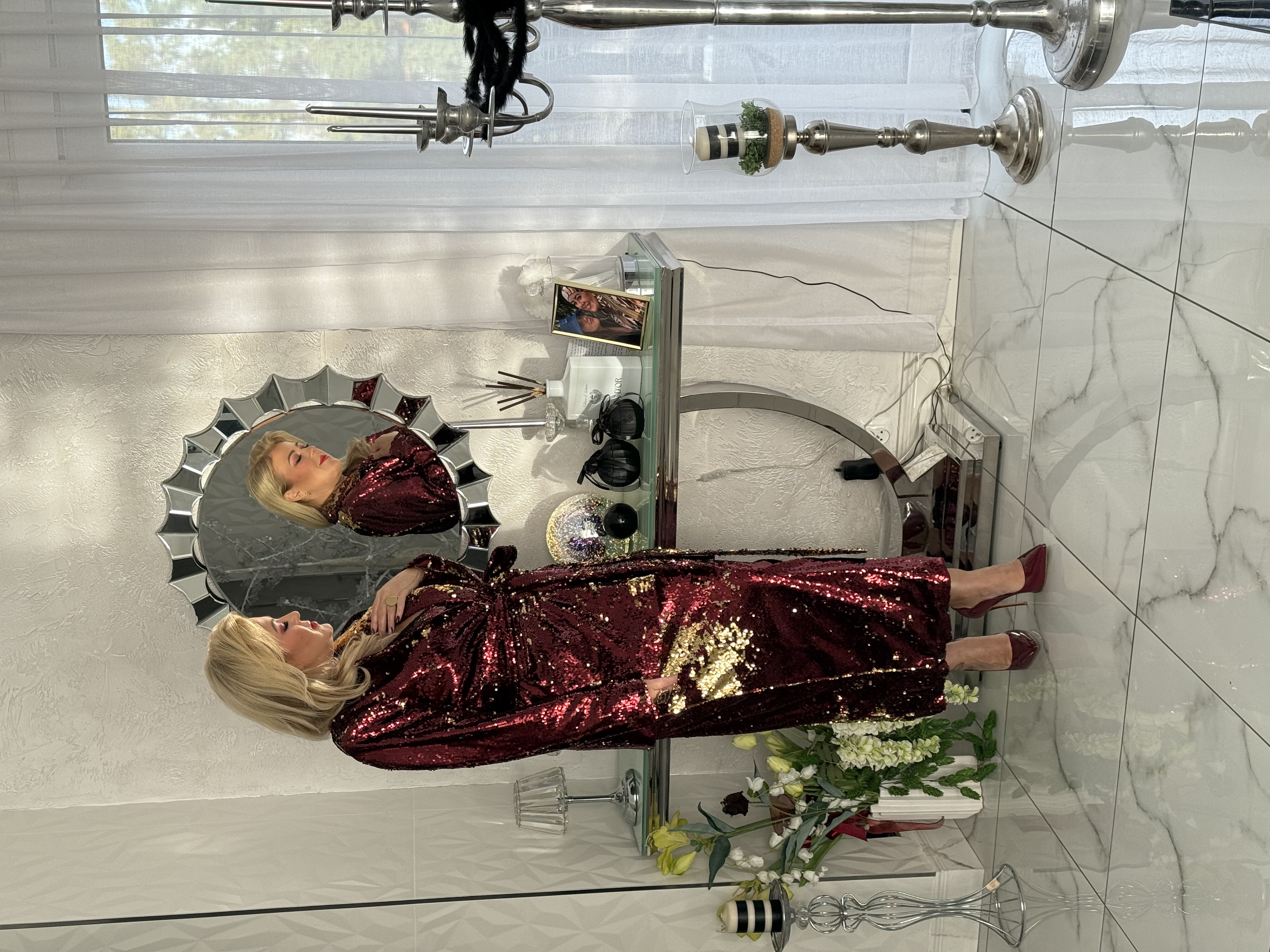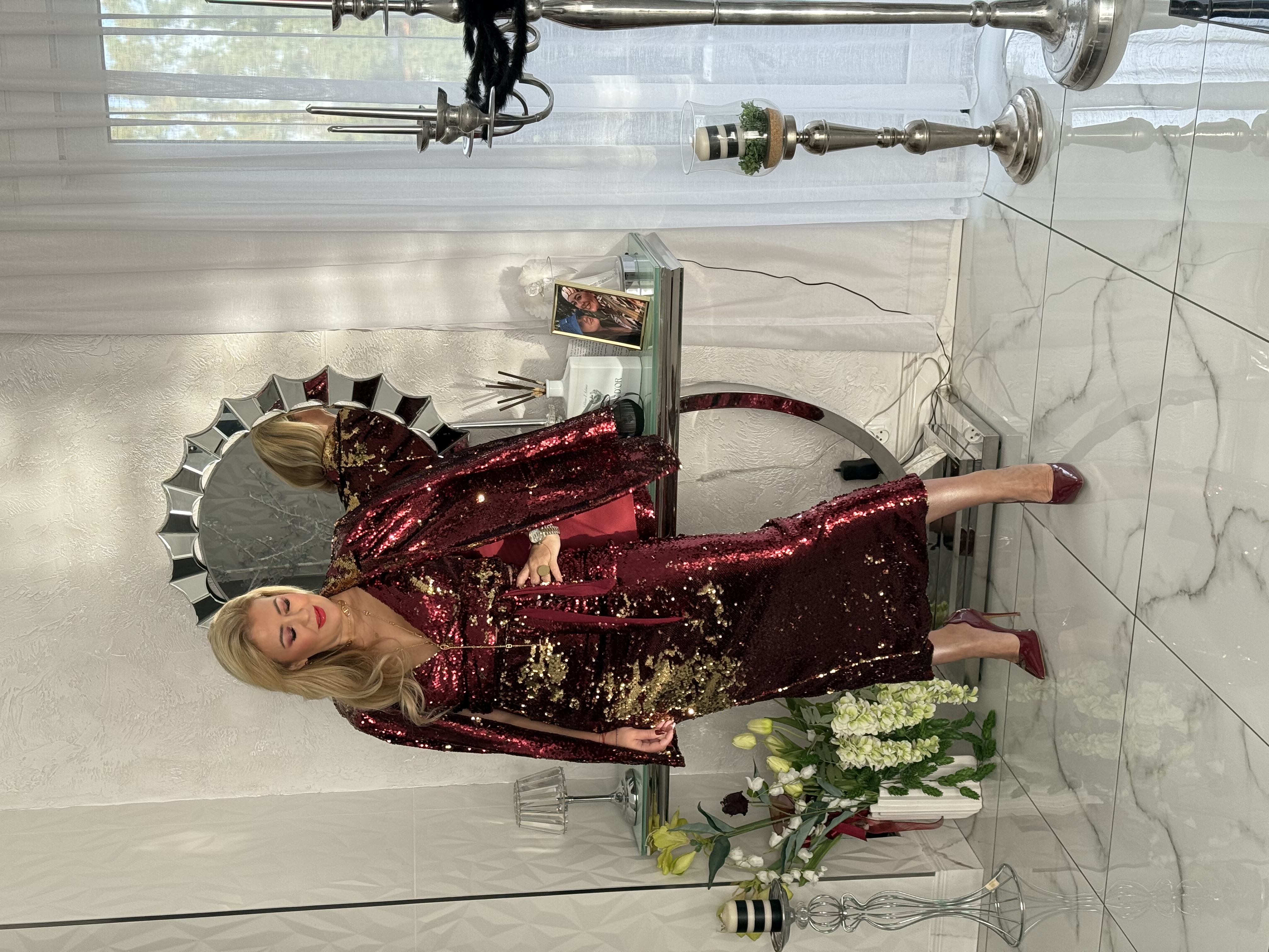 Marynarka z bordowego cekinu – klasyczny krój w błyszczącym wydaniu.